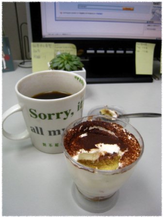 昨天下午寶貝敲我msn說要帶她做的提拉米蘇來公司,欣喜若狂的我在接著的一個半小時之內,腦子裡的提拉米蘇畫面像跑馬燈似的不停迴盪,也靜不下心辦公