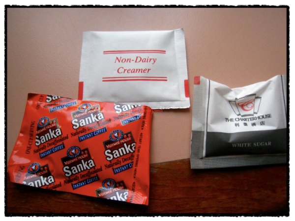 另外,我拿了飯店提供的三合一咖啡泡來喝。左起,咖啡粉、奶精、糖