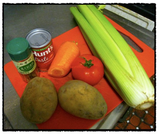 除了洋蔥(1顆)和馬鈴薯(2顆),我也準備了西洋芹(4根)、砂礫出借的胡蘿蔔(半根)和牛番茄(1顆),別忘了我最愛的義大利綜合香料(一大撮)