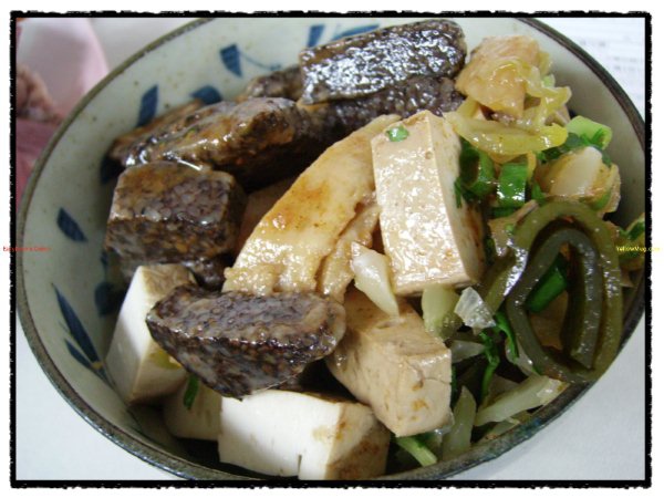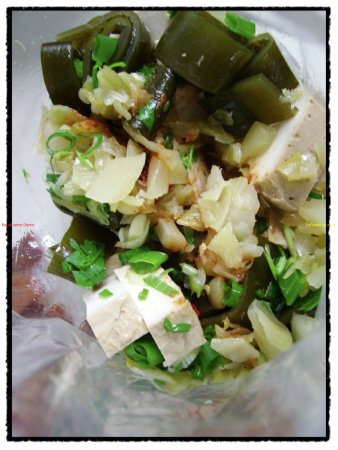 老闆非常熟練地指引如何點餐,俐落地將選好的品項切塊,灑上酸菜、蔥、薑,淋上香油。問我是否一般微辣的標準口味可接受,我想就按照老闆的指示吧!