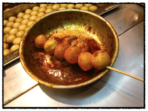 這一串也不是頂便宜的,台幣約莫要35元,老闆淋上咖哩,也沒個塑膠袋,我就傻著眼拿著一串魚丸,拖著行李走進飯店。